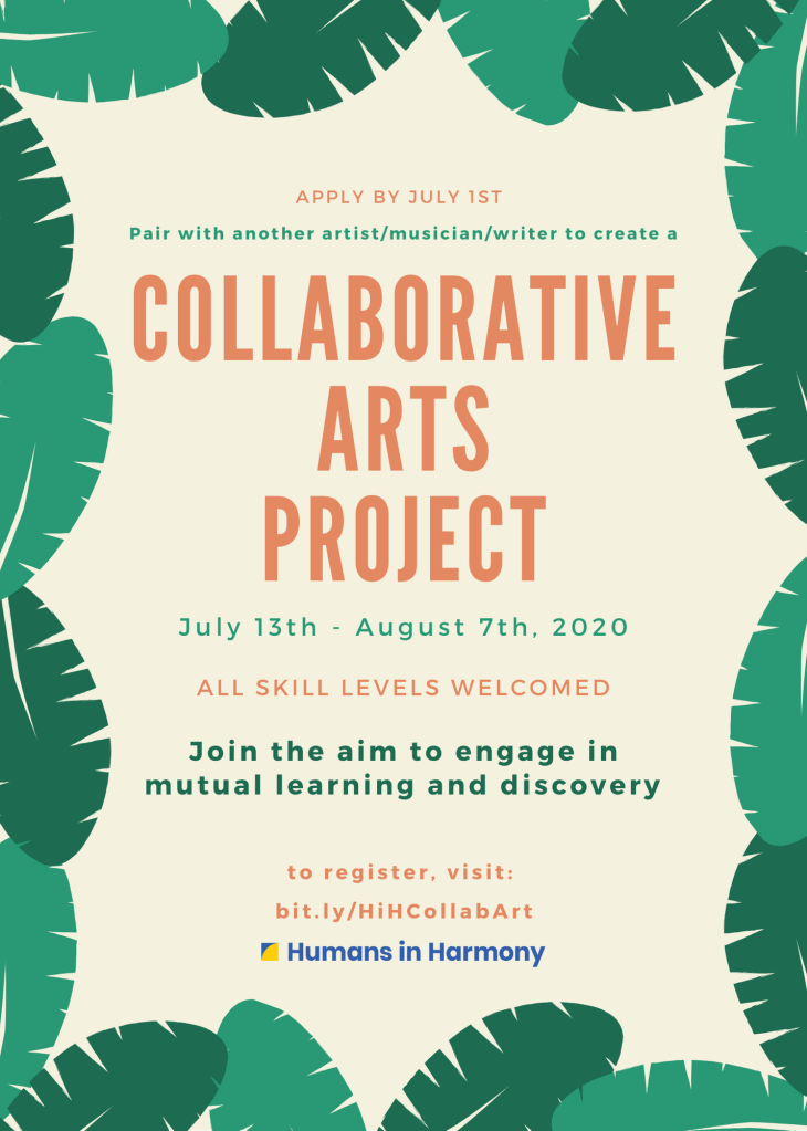 Apply to be a creative collaborator with Humans in Harmony! This is a process and space to connect with others, and to create and share musical or other creative collaborative projects. The aim is to engage in mutual learning and discovery with one another, and to jointly create our stories and possibilities together. Even if you are new to songwriting, creative writing, visual arts, or other creative arts, we encourage you to co-create with us. We believe that everyone is an artist and every person has a story to tell.
