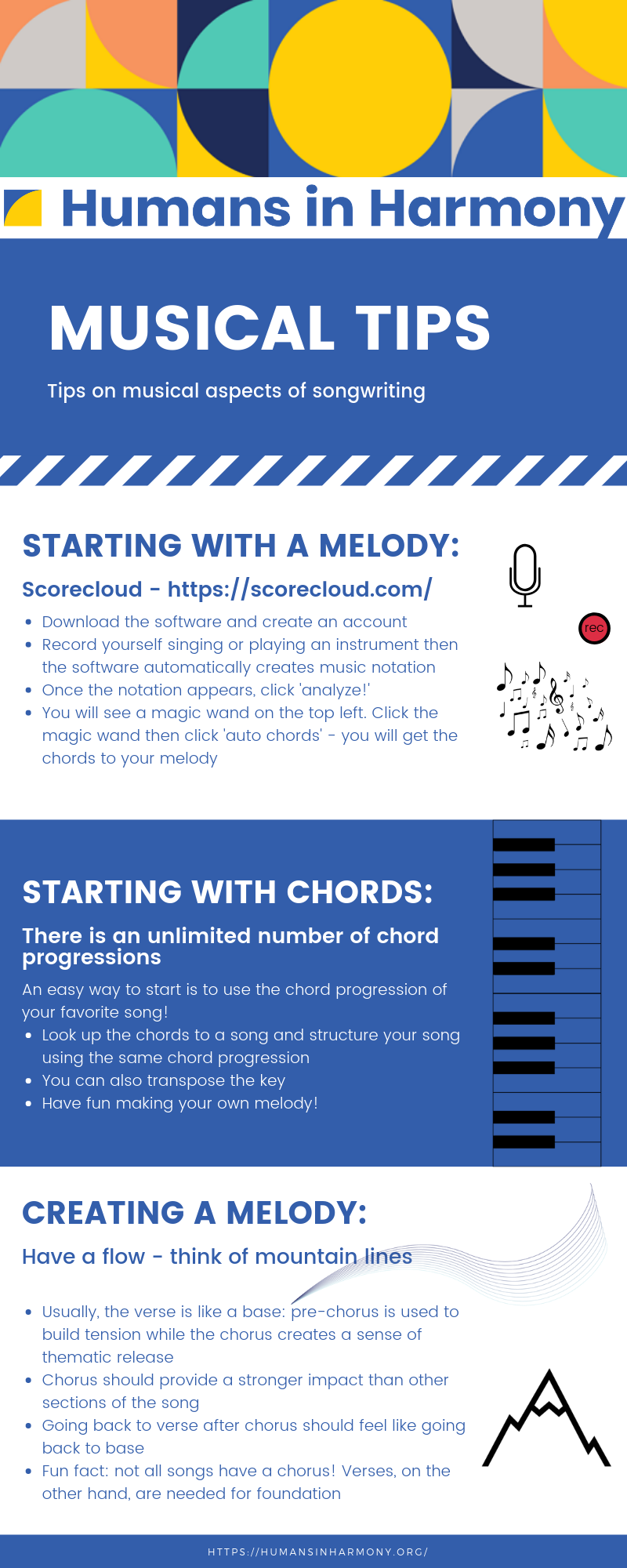 You can also check out the videos of hosting an orientation session, storytelling and lyrics workshop, melody and chords workshop, or Instrumentals and beats workshop on our youtube channel. If you have any questions about these materials or would like to help us make more, please email info@humansinharmony.org!